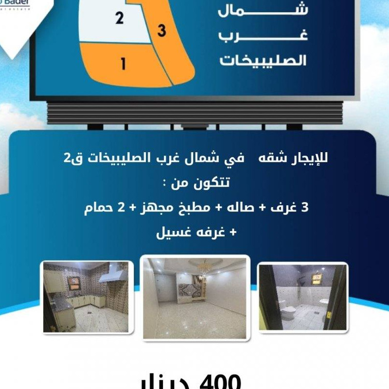 للإيجار شقه   في شمال غرب الصليبيخات ق2 تتكون من : 3 غرف + صاله + مطبخ مجهز + 2 حمام + غرفه غسيل ملاحظه // يوجد شقتين مقابل بعض سعر الإيجار  400