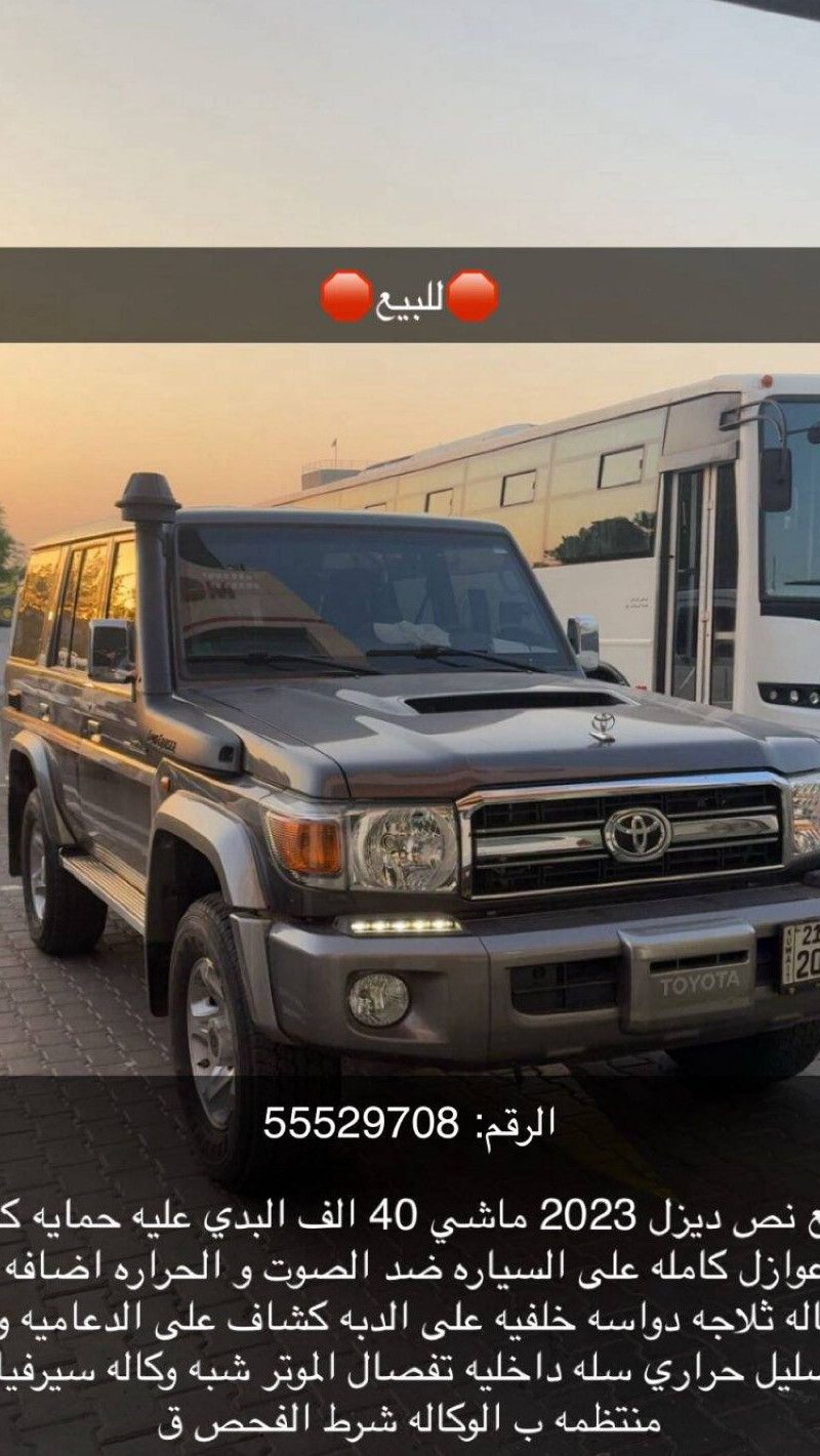 للبيع نص ديزل 2023 8v تيربو ماشي 40 الف البدي عليه حمايه كامله او عوازل كامله على السياره ضد الصوت و الحراره اضافه من الوكاله ثلاجه دواسه خلفيه على الدبه كشاف على الدعاميه ونش تضليل حراري سله داخليه تفصال الموتر شبه وكاله سيرفيات منتظمه ب الوكاله شرط الفحص قير مكينه شاصي صبغ وكاله 🛑قابل للمساومه ب المعقول🛑.