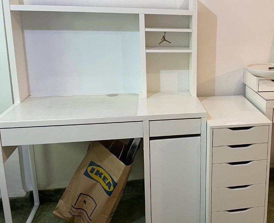 مكتب للدراسة ابيض مع ادراج تخزين جانبي بيضاء السعر : ١٥ دينار للتواصل الرقم موجود تحت جميعها بحالة نظيفة جداً