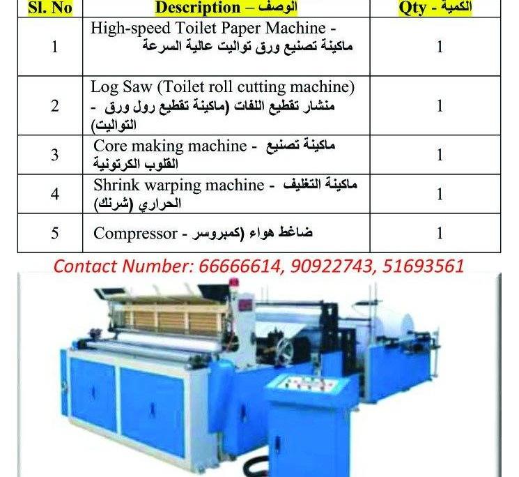 High-speed Toilet Paper Machine ماكينة تصنيع ورق تواليت عالية السرعة Log Saw (Toilet roll cutting machine منشار تقطيع اللفات )ماكينة تقطيع رول ورق - التواليت Core making machine - ماكينة تصنيع القلوب الكرتونية Shrink warping machine - ماكينة التغليف الحراري )شرنك Compressor - ضاغط هواء )كمبروس